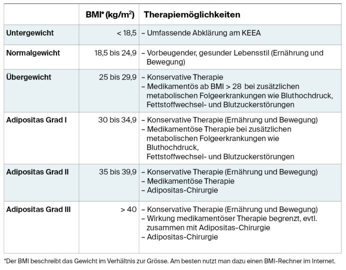 Übergewicht entsteht nicht von einem Tag auf den anderen und beruht auf mehreren Ursachen. «Am KEEA schauen wir zusammen mit den Betroffenen die Gründe für das Übergewicht an und entwickeln gemeinsam einen persönlichen Therapieplan. Dabei unterstützen sie verschiedene Fachpersonen aus der Ernährungsberatung, dem psychiatrischen Bereich, der Verhaltenstherapie, der Inneren Medizin, der Endokrinologie und der Adipositas-Chirurgie», sagt Dr. med. Gabriela Werder, Adipositas-Chirurgie. Es sei das oberste Ziel, gemeinsam eine dauerhafte Änderung des Lebensstils zu erreichen.