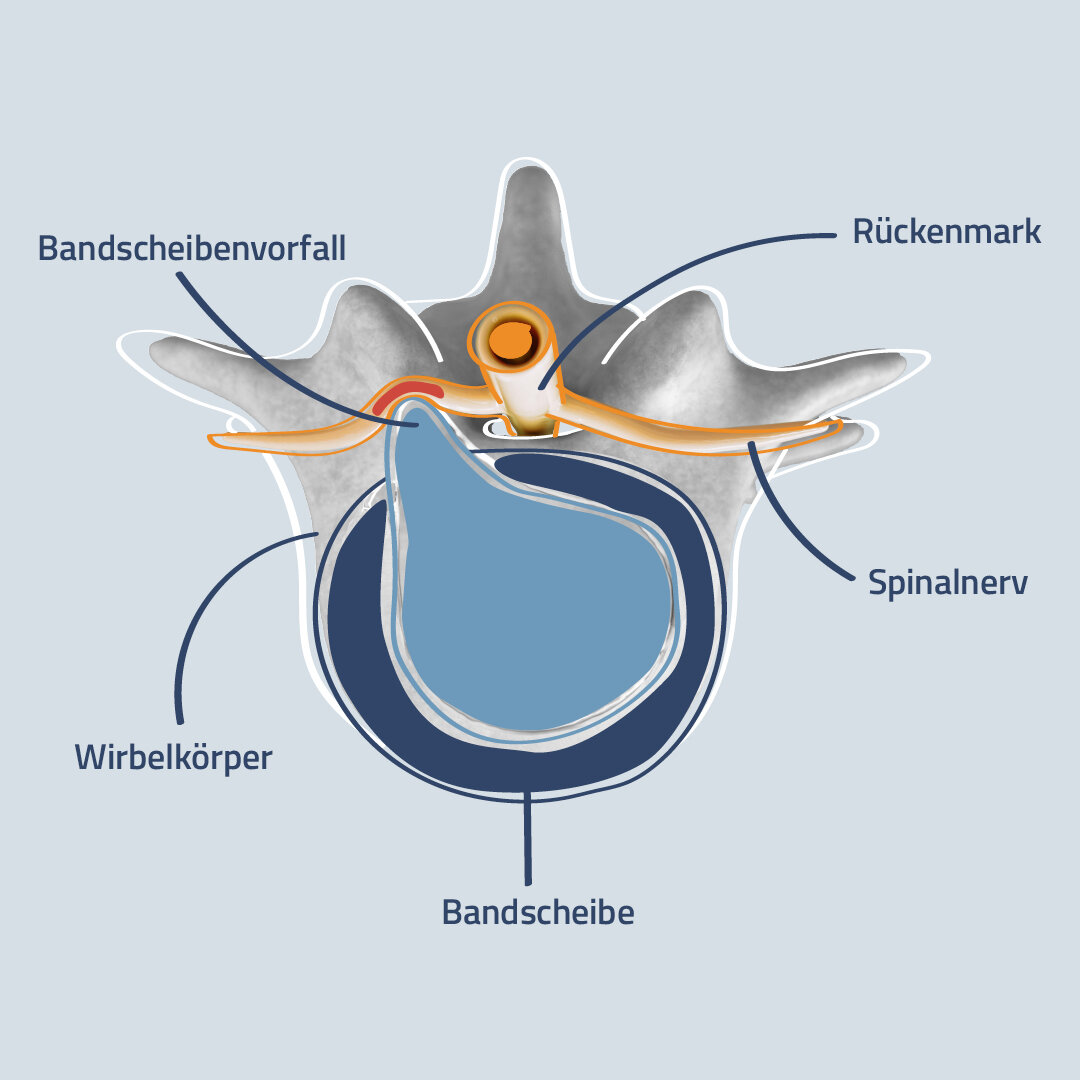 Eine Bandscheibe liegt zwischen zwei Wirbelkörpern, sorgt für die Beweglichkeit der Wirbelsäule und ist ein Puffer bei Belastungen und Erschütterungen. Sie besteht aus einem harten Faserring und einem weichen Kern. Der Faserring hält den Kern in Position. Durch Verschleiss kann der Faserring über die Jahre Risse bekommen, wodurch der weiche Kern austreten kann. Am häufigsten passiert das zwischen dem vierten und fünften Lendenwirbelkörper, aber auch an der Halswirbelsäule kann ein Bandscheibenvorfall auftreten.