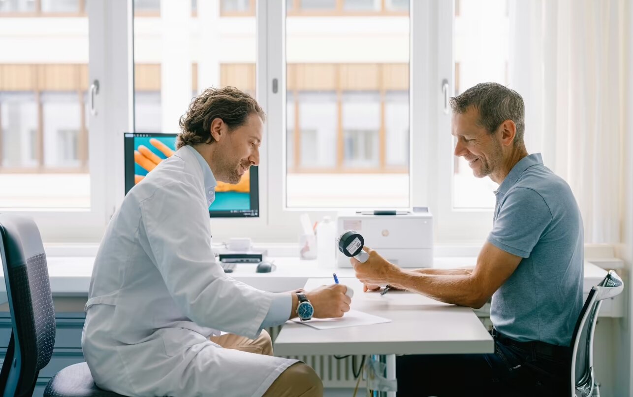 Glück im Unglück: Die zufällig vorbeifahrende Postbotin sieht ihn und reagiert geistesgegenwärtig. Sie legt ihm mit ihrem Schal einen Druckverband an und fährt ihn ins nächstgelegene Spital. Dort ist man sich einig, dass er schleunigst in die Handchirurgie des KSA verlegt werden muss. «Ich hatte Glück, dass ich überlebt habe», so Emanuel H. Trotz Medikamenten sowie Ergo- und Physiotherapie bleibt sein Handgelenk sehr schmerzempfindlich.Je nach Haltung, bei Kleidungsstücken mit langen Ärmeln oder wegen der Bettdecke: kleinste Berührungen reichen, damit ihm elektrisierende Schmerzen wie Nadelstiche durch den Arm fahren. Grund ist ein neuropathisches Schmerzsyndrom. Dabei bilden Gefühlsnerven sogenannte Endneurome, die enorm schmerzhaft sind und Emanuel H. beeinträchtigen. Doch aufgeben ist für ihn keine Option.