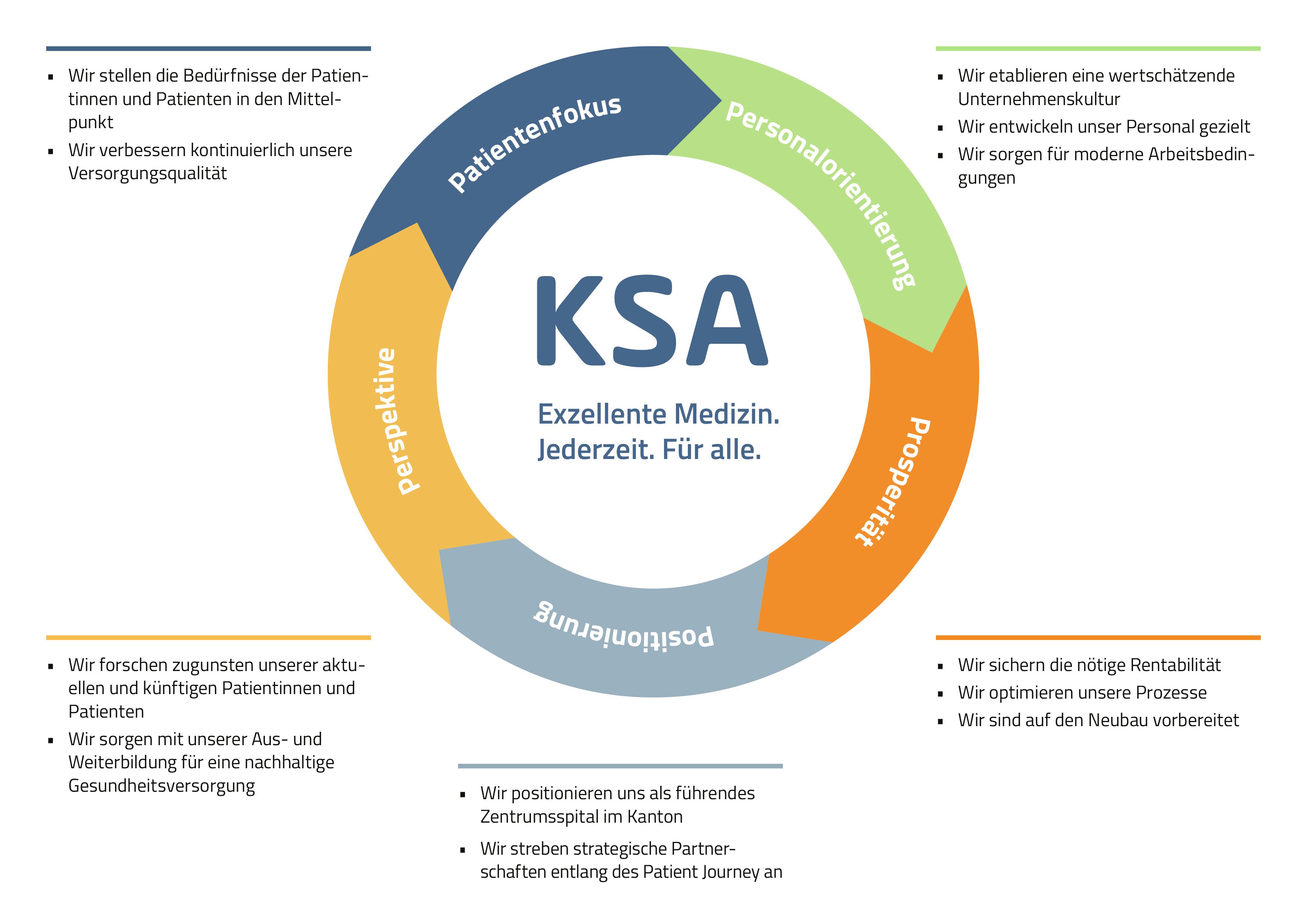 • Patientenfokus: Die Bedürfnisse der Patientinnen und Patienten stehen im Mittelpunkt. Die Versorgungsqualität wird durch ein gelebtes Qualitätsmanagement, kontinuierliche Verbesserungsmassnahmen, bedarfsgerechte Infrastrukturen und digitale Lösungen laufend verbessert. Das KSA will die kantonalen Vorgaben erfüllen und verfolgt einen «best-in-class»-Ansatz.