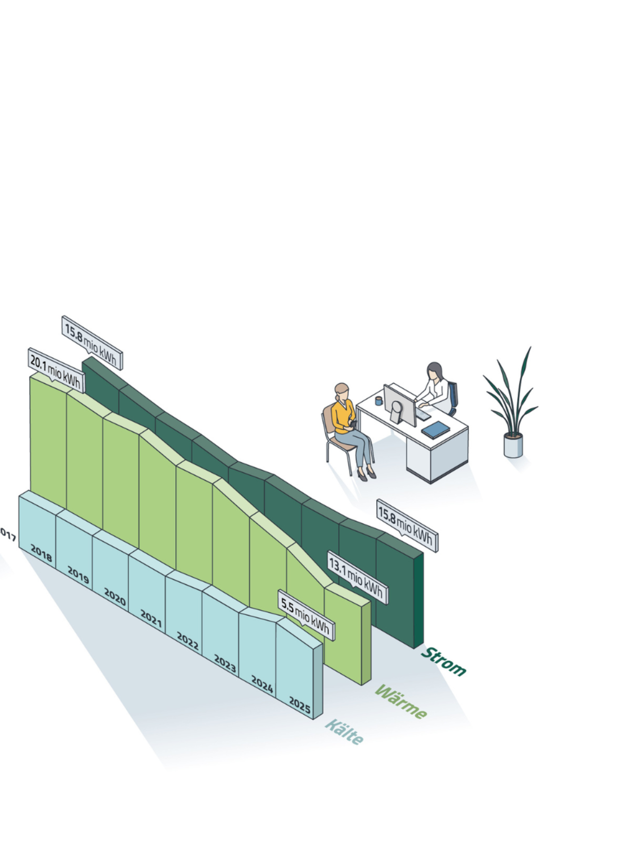 DDer Wärmeverbrauch sank auf rund 13,1 Mio. kWh (2024: 15,1 Mio. kWh). Dennoch lagen die gesamten CO₂-Emissionen mit rund 2526 t